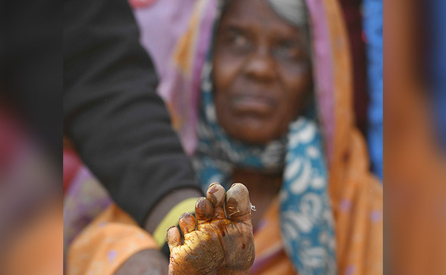 Sakku Bai, 62, holds up her injured foot for treatment at a temporary clinic (AFP)
