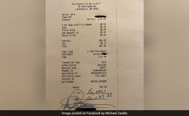 In the post, restaurant owner Michael Zarella thanked the anonymous diner for his generosity. Sharing the image, Mr Zarella wrote, "Stumble inn had a very generous customer. We thank you for your generosity." The receipt shows the diner left a tip of $16,000 - which is over Rs 11 lakh.