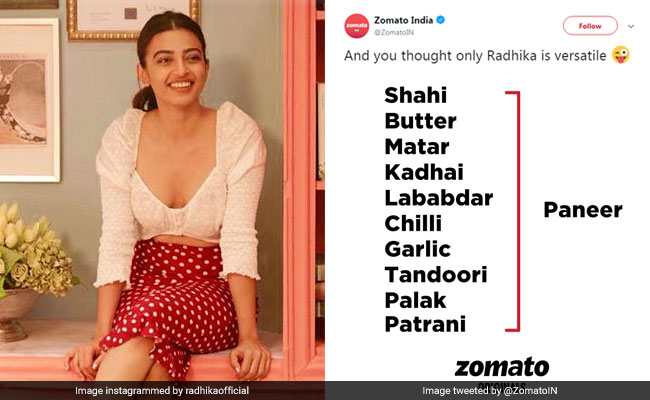 It all started when Zomato posted a tweet on... wait for it... paneer. The tweet is accompanied by a picture that innocently details how paneer can be used in so many different dishes. The thing that wins this tweet, though, is the text posted with the picture. "And you thought only Radhika is versatile," reads the tweet.