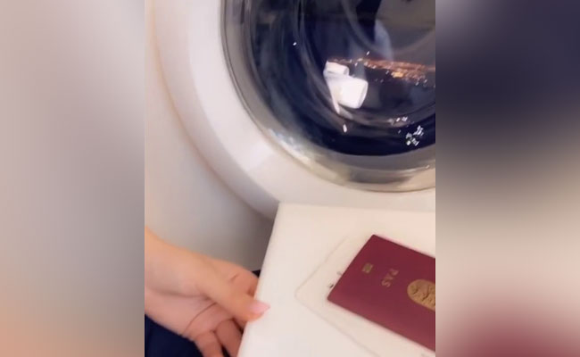 The video begins with a view of what appears to be a city lit up at night, as seen from a plane window. The camera then zooms out to show a passport on a tray table, reinforcing the idea of a plane journey in progress. The illusion is shattered, however, when the camera pulls out to reveal the 27-year-old pilot sitting in front of her washing machine.