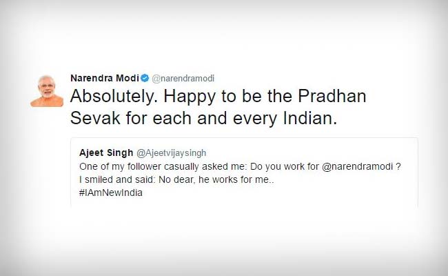 A user on Twitter had quite a day when his tweet was spotted by the Prime Minister. The man named Ajeet Singh shared a joke about PM Modi working for him and got a witty response from the 'pradhan sevak' himself. "One of my follower asked me: Do you work for Narendra Modi. I smiled and said: no dear, he works for me", he tweeted on Tuesday. Quoting his tweet, PM Modi gave him the ultimate affirmation. The tweet was one of the many on Twitter pledging support to PM Modi's #IAmNewIndia campaign. His response was retweeted more than 7,000 times and cheered his supporters. Narendra Modi first called himself 'pradhan sevak' in August 2014 in his first independence day speech as PM. "My beloved countrymen! I have come here not as a 'pradhan mantri' (PM) but a 'pradhan sevak", he announced from the ramparts of the Red Fort.