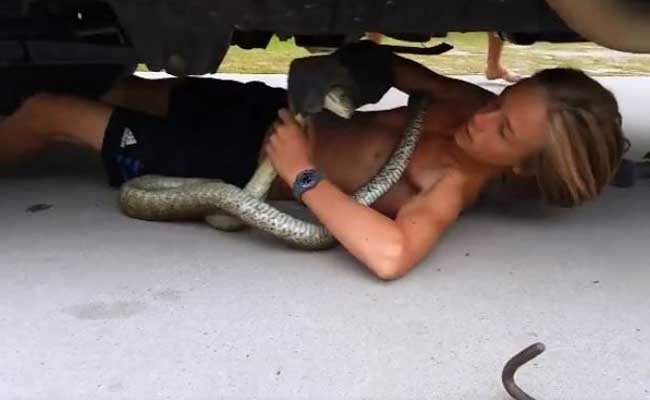 Uploaded by Yogi McDougall from Queensland, Australia, the video shows the teen lying under a vehicle. You can clearly see him trying to pull the snake out from it. Another man can be seen holding the snake's tail.