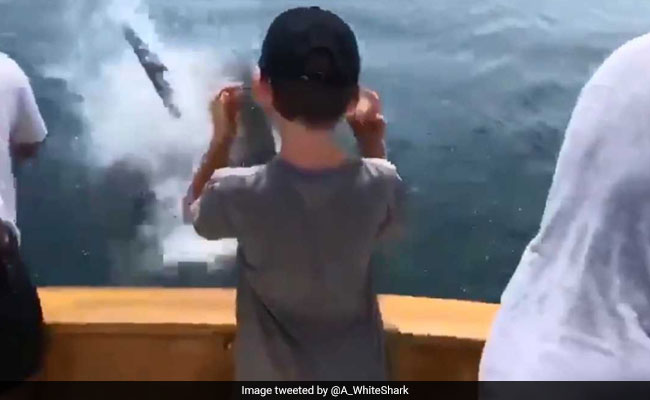 Mr Nelson's son, Jack, can be seen on the video recoiling as the shark jumps out of water.