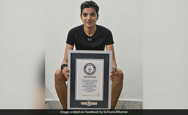 Sufiya Khan has set a Guinness World Record for the shortest time taken to travel the 'golden quadrilateral' - a network of national highways connecting Delhi, Mumbai, Kolkata and Chennai - by foot. The ultra runner from Delhi completed a journey of 6,002 km in just 110 days, 23 hours and 24 minutes.