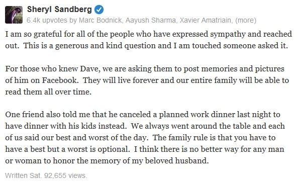 On May 6, a Quora user asked, "How can we express our sympathy for Sheryl Sandberg after the tragic death of her husband?"