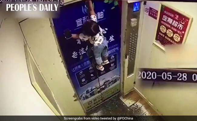 A toddler in China was rescued unhurt after getting dragged up the doors of an elevator. Heart-stopping footage of the incident shows the girl hanging mid-air after she was dragged towards the ceiling when the elevator started moving. According to news website People's Daily China, the incident occurred after the girl stepped into the lift alone with leash attached to her wrist. Her caregiver was standing outside the lift when the doors closed and it started descending, pulling the toddler up towards the ceiling.