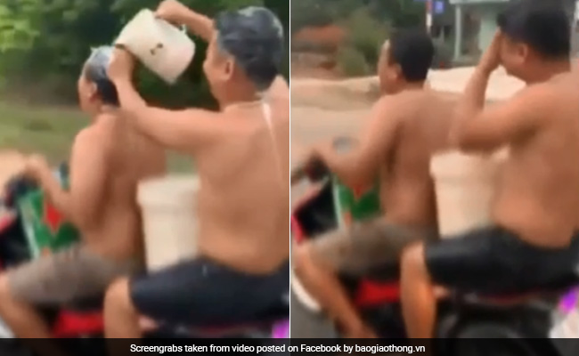 In the footage that is being widely circulated online, the two men sit on the bike with a bucket of water between them and a carton of beer at the front. Both appear to be shirtless and lathered with soap. The man riding pillion then pours water on himself and the driver, who balances the bike with one hand as he uses the other to wash his face and hair.