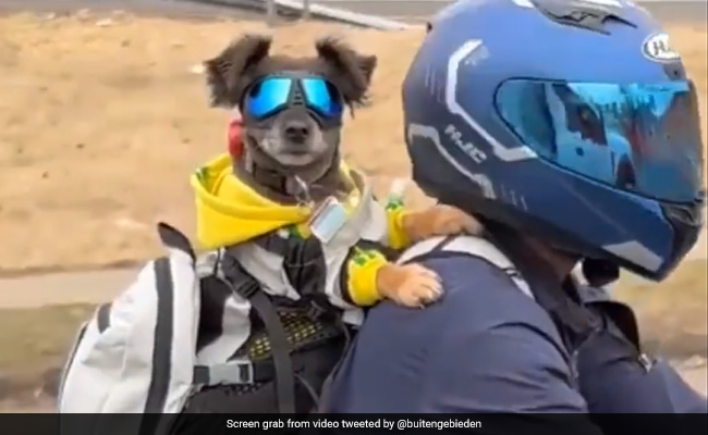 The clip, which was recorded from inside a car, opens to a bike rider, who is waiting at a traffic signal. The person, who has a helmet on, looks at the camera and waves. But the men, in the car, were keen to take a look at his furry friend, who was busy admiring the view on the other side.