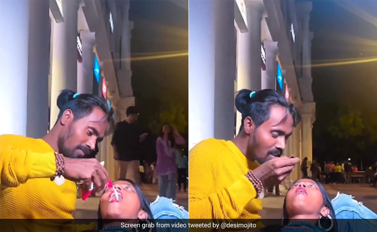 In the now-viral video, the couple is seen sitting at Delhi's famous hangout spot, Connaught Place. In the video, the man is seen emptying a packet of milk into the woman's mouth as she lay in his lap. Further, he takes out a spoon and places it in her mouth. He then takes some milk on the spoon and drinks it. He continues to do it two to three times and later gives a thumbs-up to the woman. Meanwhile, people in the background can be seen walking past them, not paying attention to their antics.
