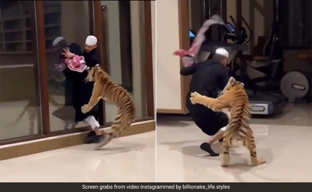 The short video was shared by the Instagram page Billionaire's Life Style. A pet tiger is shown in the beginning of the video chasing a man inside the living room of a swanky UAE home. Initially, he is seen smiling as the feline runs behind him, However, he tumbles and falls on the ground but the tiger continues to grab him. The terrified man then tries to stand up and runs again from the pet.