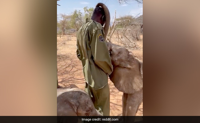 The short clip was shared on Reddit along with a caption, "Baby elephants love their keeper". It showed two baby tuskers wrapping their trunks around their keeper's body in an affectionate way.