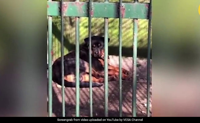 In the short clip, the visitor walks up to the cage and spots a dog, which appears to be a Rottweiler, resting inside. "Woof! Are you a wolf?" he says to the animal.