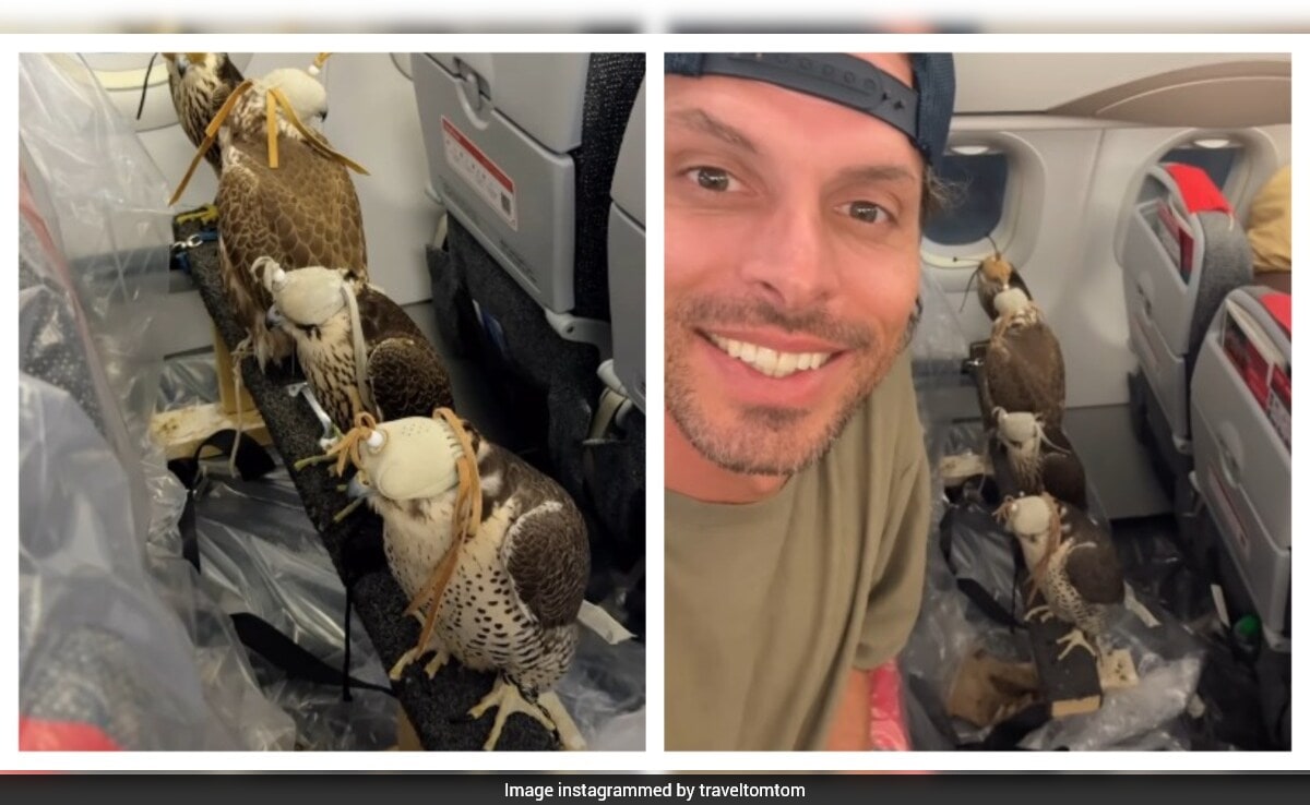 A Dutch traveller recently captured a rare sight on a commercial flight in the Middle East, where an entire row of hooded falcons was calmly seated in the cabin. Tom recorded a short video showing several falcons perched on passenger seats, all appearing quiet and calm. The birds wore hoods to keep them relaxed during the journey.