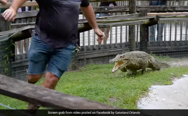 In the clip, a man, who is also in the enclosure, was seen running away from the crocodile.