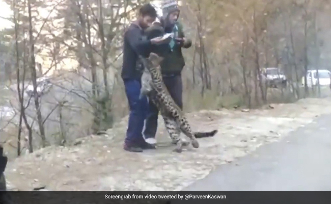In the video, which was reportedly filmed at the Tirthan Valley in Himachal Pradesh, the big cat was seen walking up to a group of people standing on a roadside. While some people scrambled to get away, one stood still as the leopard approached and tried to climb him playfully. Another man was then filmed playing with the big cat in a scene that has raised eyebrows on social media.