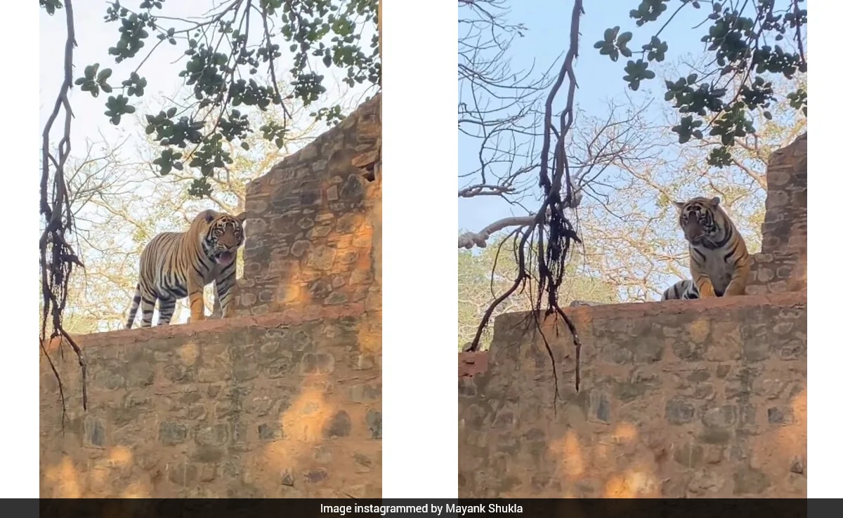 - A tiger was spotted near tourists on an old stone wall in Ranthambore National Park