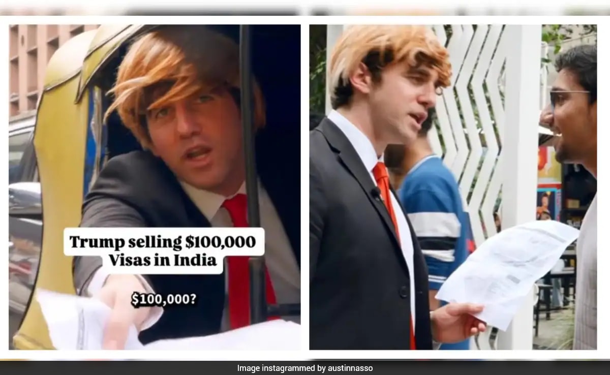 A hilarious video of an American comedian spoofing US President Donald Trump by "selling" H1-B visas for $100,000 on the streets of India has sparked widespread amusement online. In the video, Instagram creator Austin Nasso fully embodies the Trump persona, complete with a red tie, exaggerated expressions, and signature mannerisms. He approaches passersby and, in a Trump-like voice, declares, "We are selling H1-B visas for 100,000 dollars."