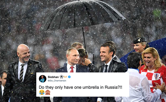 In what has been turned into a massive joke on social media, Mr Putin stood between FIFA president Gianni Infantino, French President Emmanuel Macron and Croatian President Kolinda Grabar-Kitarovic on the podium, even as they got drenched in the rain and he was protected by his umbrella.
