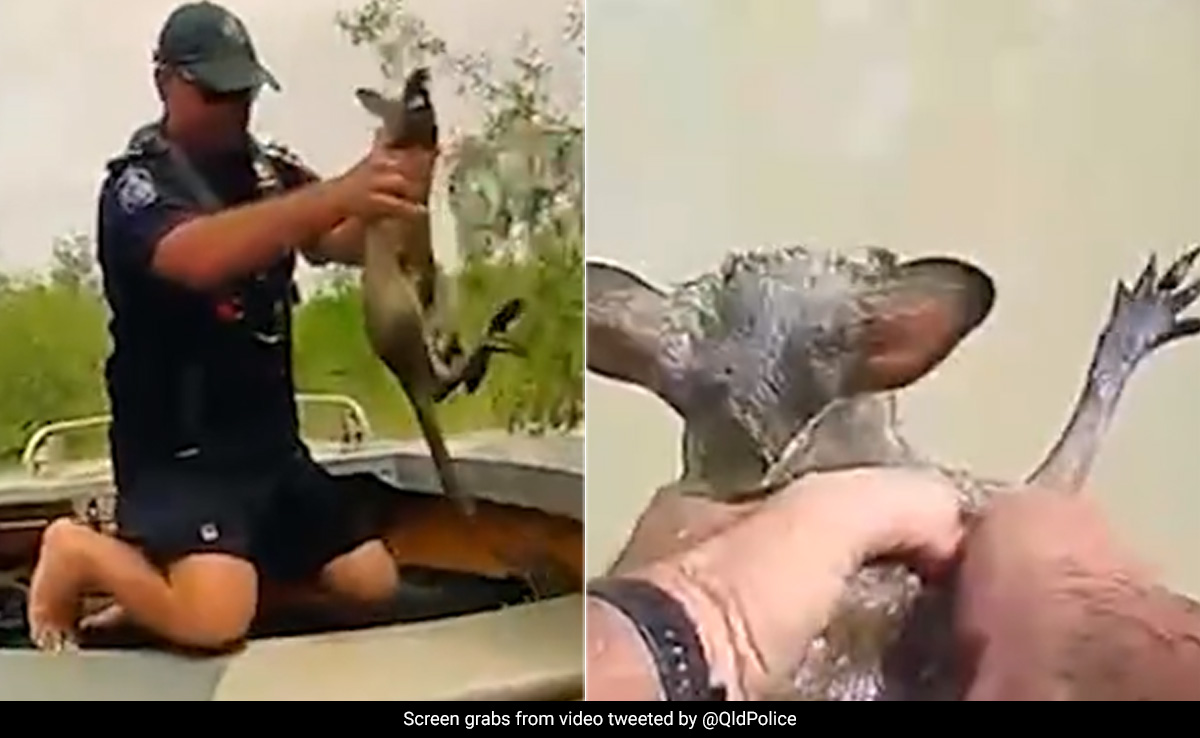 A video has emerged on Twitter showing a cop in Queensland, Australia, successfully rescuing a baby kangaroo that had gotten stuck in crocodile-infested floodwaters. According to a BBC report, the kangaroo joey was spotted swimming near two large crocodiles by a helicopter pilot, who alerted Queensland Police.
