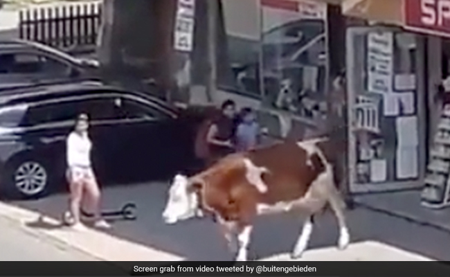 The video, in the beginning, shows very few people on a quiet street around a supermarket in Austria. Suddenly, a cow emerges from the store and walks on the streets leaving people surprised. A man standing outside the supermarket is seen capturing this incident on his mobile phone.