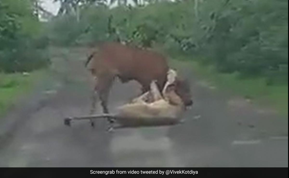 A video showing a farmer saving his cow from a lioness attack in Gujarat has been gaining traction on social media. It was posted on Twitter by Vivek Kotadiya, corporator of Keshod in Gujarat's Junagadh. His tweet said that the incident took place in the Gir Somnath district when the lioness pounced on the cow. The farmer is seen walking up to his cow and attempting to chase away the lioness. The clip was recorded by a passenger who was passing by.