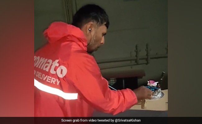 A video posted on Twitter by Kishan Srivatsa shows a group of friends celebrating the New Year with a Zomato delivery agent. The delivery agent arrived with their order just when the clock was about to strike 12. So, the group of friends made him cut the New Year's cake as fireworks can be heard in the background. After cutting the cake, the man is seen offering it to them as they wish the delivery agent a Happy New Year.
