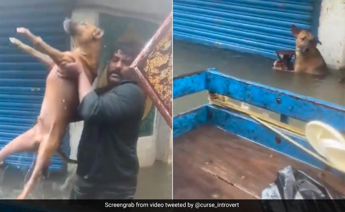 On Monday, Chennai witnessed heavy rains due to Cyclone Michaung which flooded various parts of the city and disrupted normal lives. Though rains have stopped now, most parts of the city still remain submerged, with heavy inundation in low-lying areas. Not just humans, but animals are also badly affected by the rising water levels and widespread destruction. Thankfully, humans are not abandoning their furry friends, and coming to their rescue. One such video has surfaced on X showing two men rescuing two dogs trapped on the side of a road.