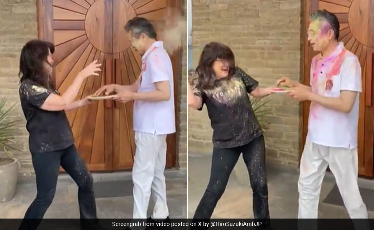 The colourful and vibrant festival of Holi is being celebrated across the country. As one of the most important Hindu festivals in India, Holi marks the end of winter and is a two-day-long festivity. The day is synonymous with colours and sweets, with people meeting friends and family members and smearing gulal on them. Now, a video of Japan's Ambassador to India, Hiroshi Suzuki, playing Holi with his wife, Eiko Suzuki has surfaced on X, delighting Indian users.