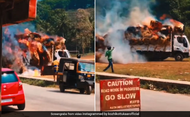 One man's quick-thinking prevented a major tragedy in the town of Kodenchery in Kerala. On Sunday, a lorry laden with rice straw caught fire after coming in contact with an overhead power line, reports Manorama Online. The driver of the lorry stood by helpless, certain that his vehicle would be destroyed in the fire - but one man jumped into action to save the lorry and avert a bigger tragedy.
