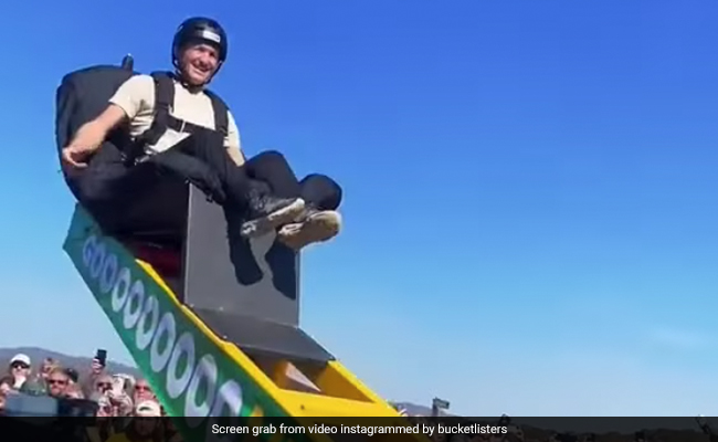In the clip, uploaded on Instagram, a person, with safety gear, is sitting on a catapult-like machine. Soon, the man is catapulted to a height above the platform before he plunges into a valley and opens his parachute over a river.