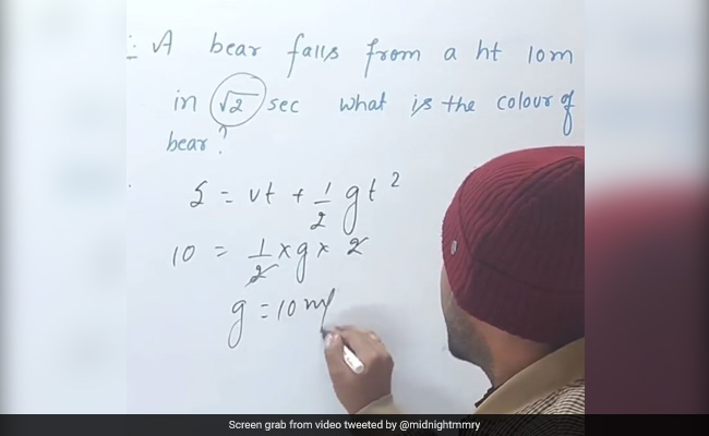 In the video shared by a user on Twitter, Mr Anand can be solving the equation which reads, "A bear falls from a height 10m in √2 sec. What is the colour of bear?" For many of us, the question seems almost impossible to be solved. However, Mr Anand actually had an answer to it. According to him, the calculated value of gravity is equivalent to the gravitational force felt at the Earth's poles, hence the bear is undoubtedly a polar bear. Therefore, the bear would be white in colour.