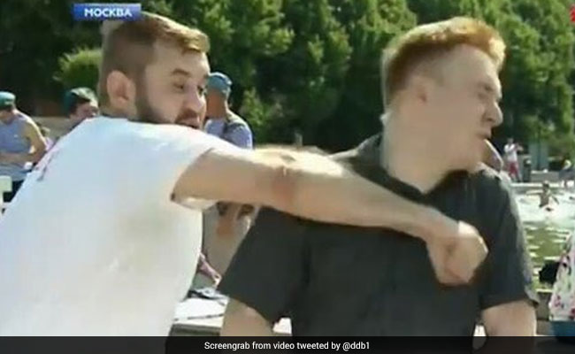 A man walked up to a journalist broadcasting live from a Moscow park on a popular Russian television channel and punched him in the face.