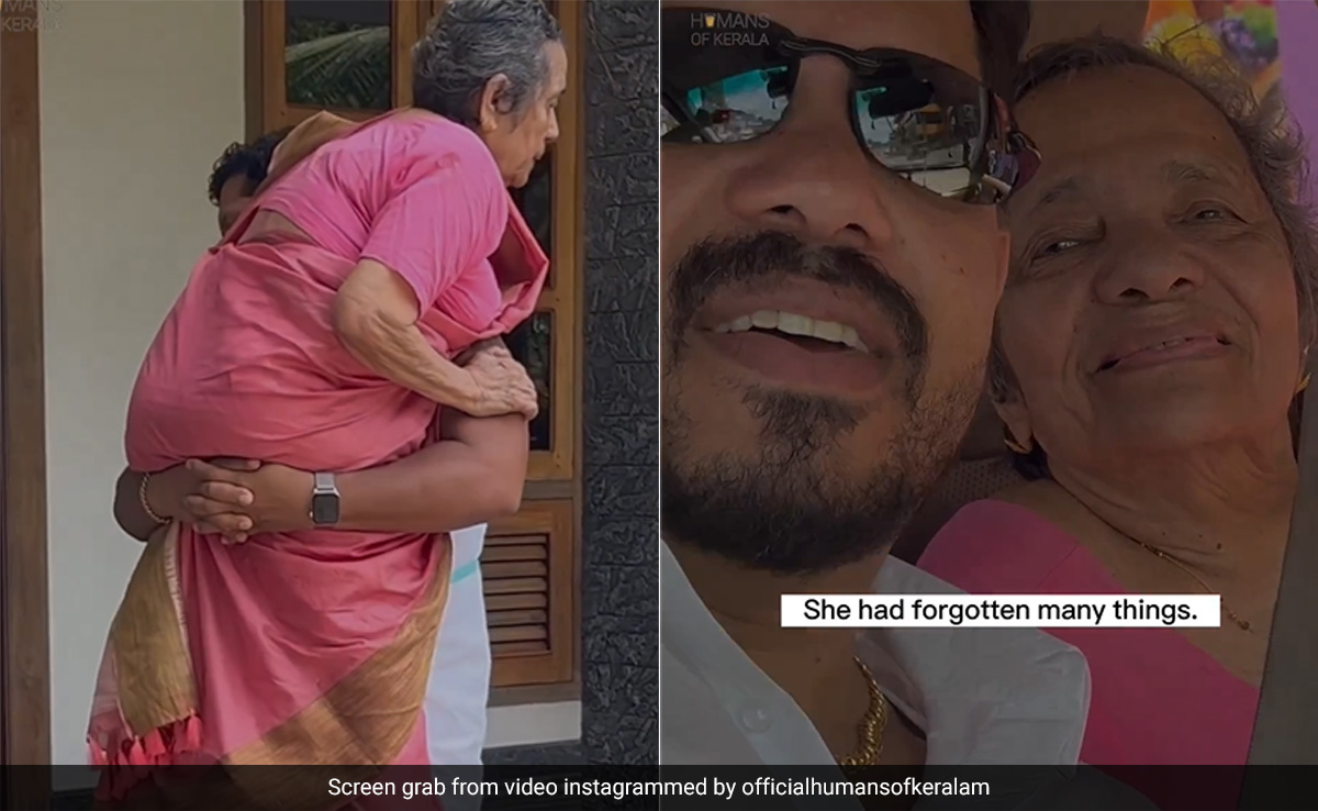 The video was shared by the Official Humans of Kerala on Instagram. Rojan Parambil, a native of Kerala who had spent five years in Switzerland, was distressed to see his mother's deteriorating health upon his return to India. In the video, Mr Parambil carries his mother to the car to take her out to show her around Athirumpuzha, which also happens to be her hometown. Another woman is seen offering her a cup of tea which she sips happily. The mother-son duo also clicks a selfie and enjoys the time together.