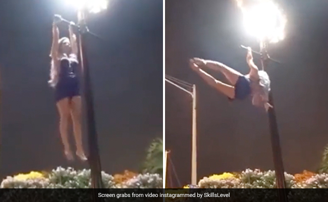 The clip starts with the woman smiling and slowly walking towards the lamp post. She is then seen removing her high heels and gracefully climbing the pole. As soon as she reaches the top, the woman then performs some incredible stunts.