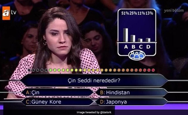 On the Turkish version of the popular game show Who Wants To Be A Millionaire? (The Indian version is known as Kaun Banega Crorepati?), a contestant used up two of her lifelines to answer where the Great Wall of China is located. According to Hurriyet Daily News, 26-year-old Su Ayhan was stumped when asked to name the location of the Great Wall of China. The Economics graduate from Istanbul was given four choices: China, India, South Korea, and Japan.