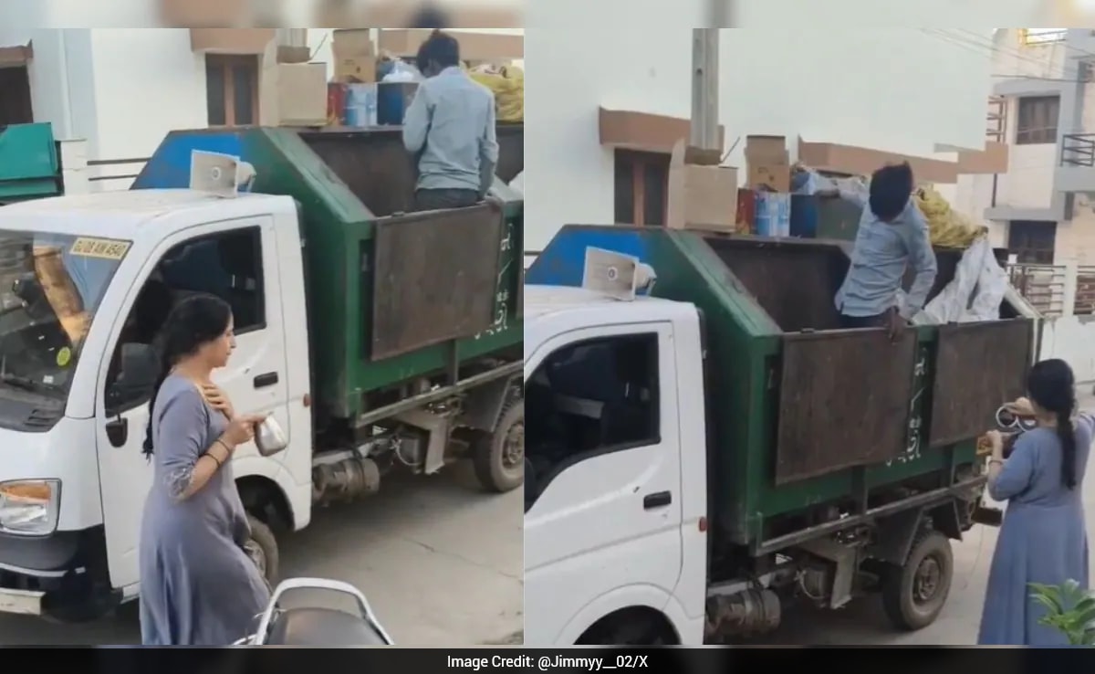 The video shows a woman coming out of her house every morning around 7:15 am. As garbage trucks pass by her neighbourhood, she emerges with a pot of freshly brewed tea in her hand.