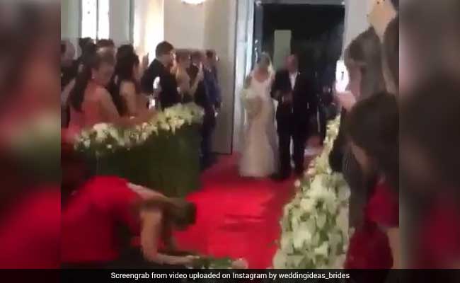 As the bride entered the church, guests took out their mobile phones to record the special moment. But one guest in particular was so focused on recording the bride's entrance, she knocked over a makeshift fence that lined the aisle in the church. She tumbled on the aisle briefly taking the attention away from the bride. Not cool.