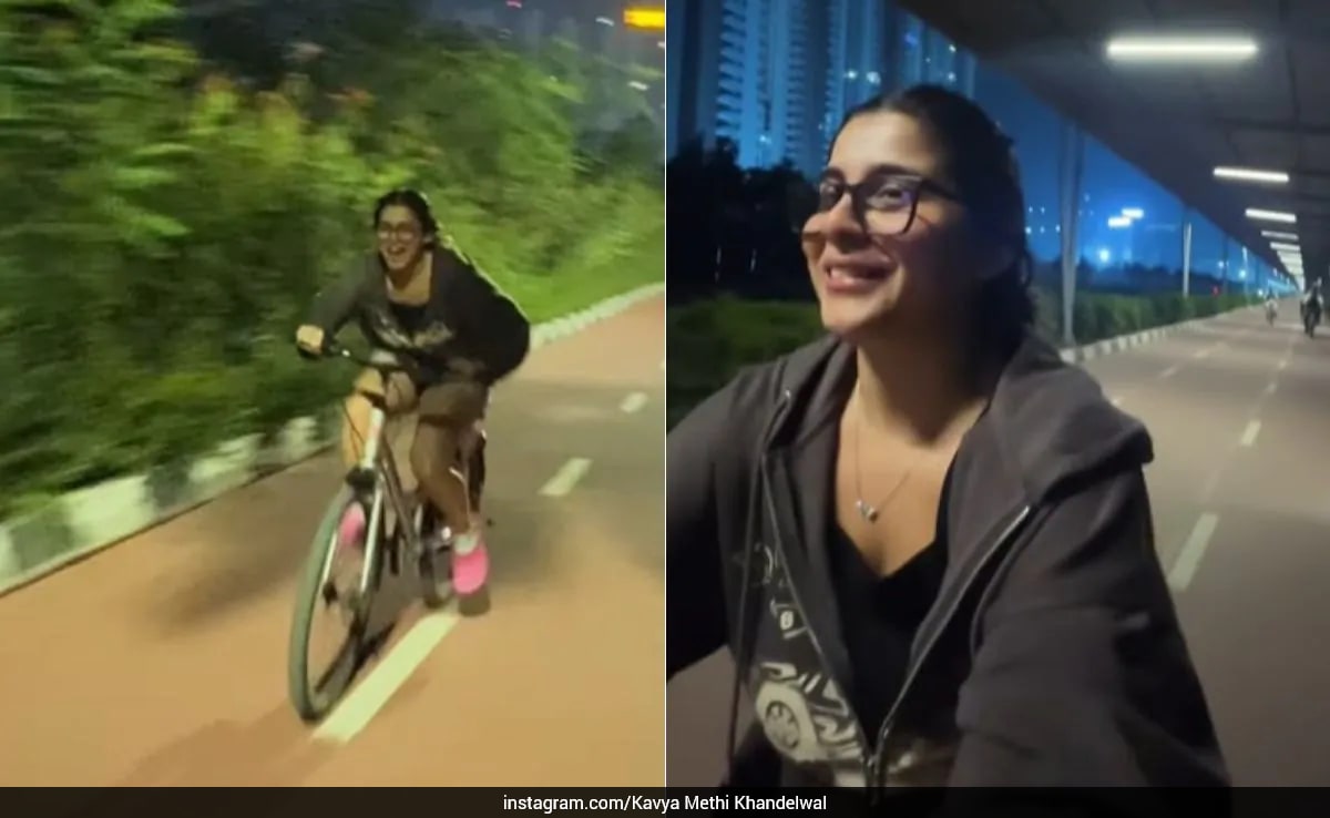 In an Instagram reel, content creator Kavya Methi Khandelwal shared her excitement while cycling at 2 AM on empty, well-lit roads. The video begins with her smiling as she rides through the quiet streets, commenting on how calm and safe Hyderabad felt at that hour.