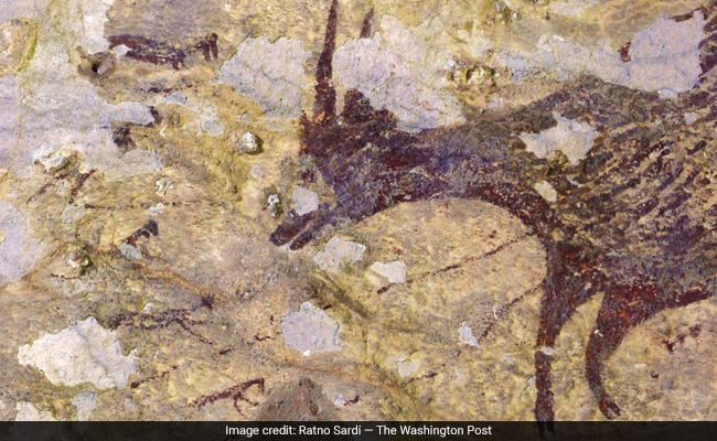 People living on the island of Sulawesi drew this image of pigs and horned animals as long as 44,000 years ago, according to a study published Wednesday in the journal Nature. Surrounding the animals are people or humanlike figures. This artwork predates the charcoal cave art in Europe by thousands of years.