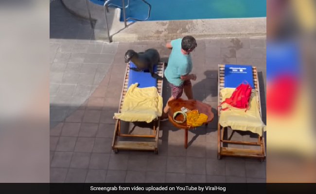 The video has been posted by ViralHog on YouTube with a caption, “Sea Lion Comes on Land, Swims in Pool and Steals Man's Chair.”