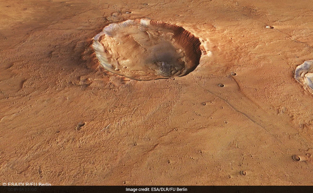 The crater was formed when a space rock collided with its red-brown surface, causing "two distinct lobes of material to be flung outwards to the crater's north and south, creating two outstretched 'wings' of raised ground."