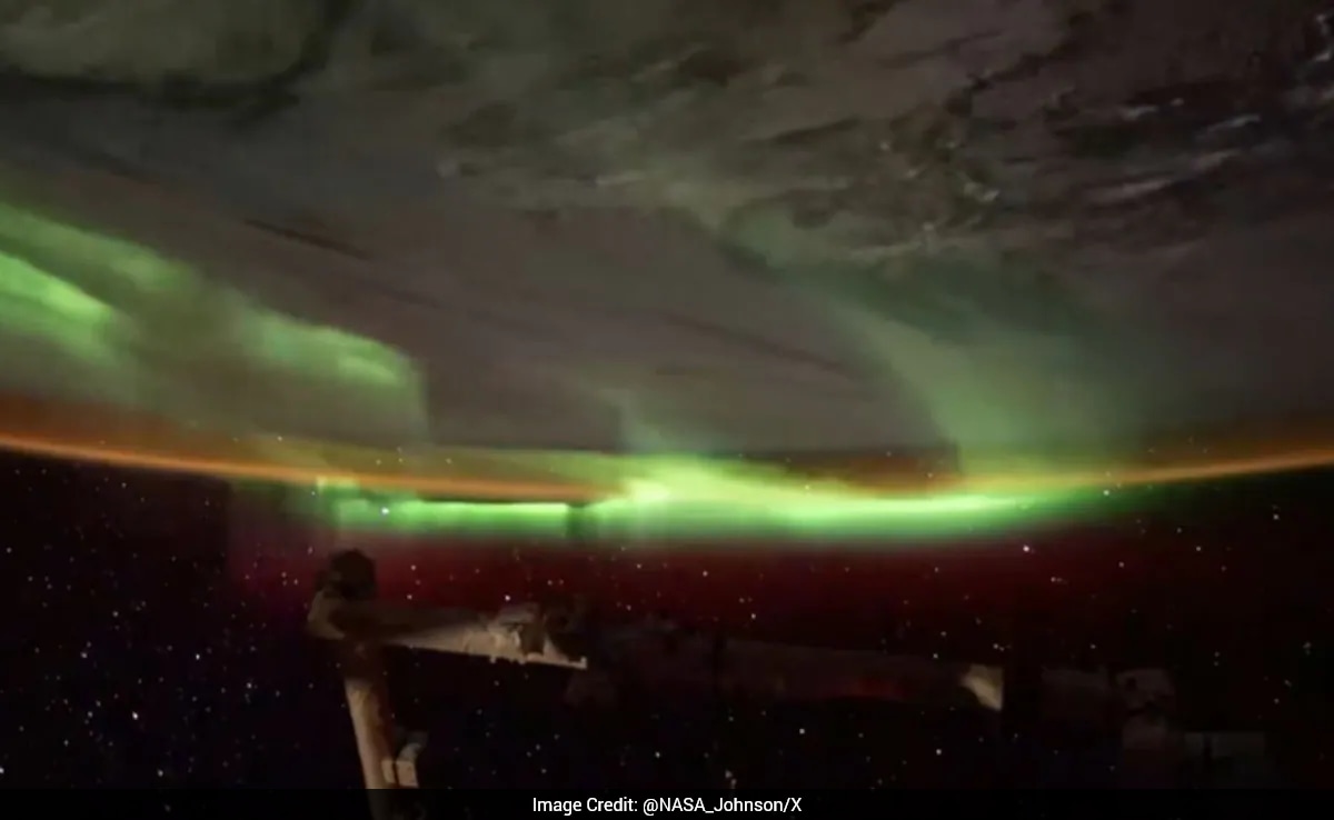 In the post, NASA described the scene as a mesmerizing cosmic light radiating from space orbit. Recorded from the International Space Station, the scene shows bright green aurora streams waving above Earth. Parts of the space station are also seen floating in the video.