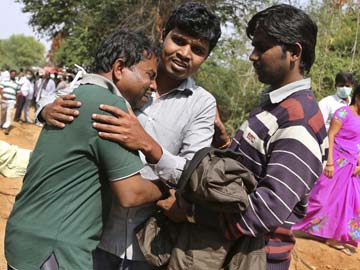 A man on consoled by others after news of the death of his wife and father-in-law in the Andhra Pradesh train accident.