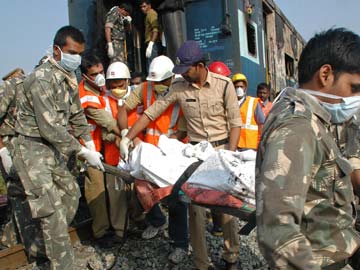 Indian rescue personnel carry away the remains of a passenger from the Nanded-Bangalore Express near Puttaparthi in Ananthpur District, some 300kms south of Hyderabad.