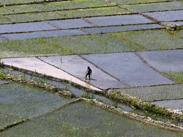 A farmer walks through a paddy field.