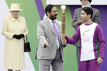 Bindra, India's only individual Olympic gold medallist, took the baton from Organising Committee Chairman Suresh Kalmadi to mark the beginning of the 340-day relay journey from Buckingham Palace here.