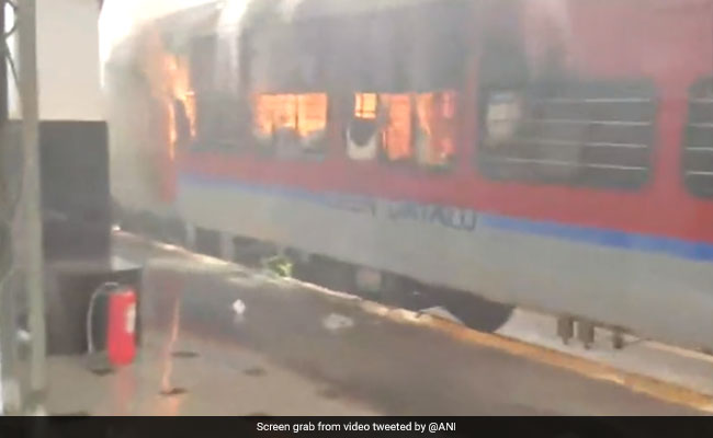 The protestors vandalised the windows of a train and torched a two-wheeler on tracks and a few bags on the platform.