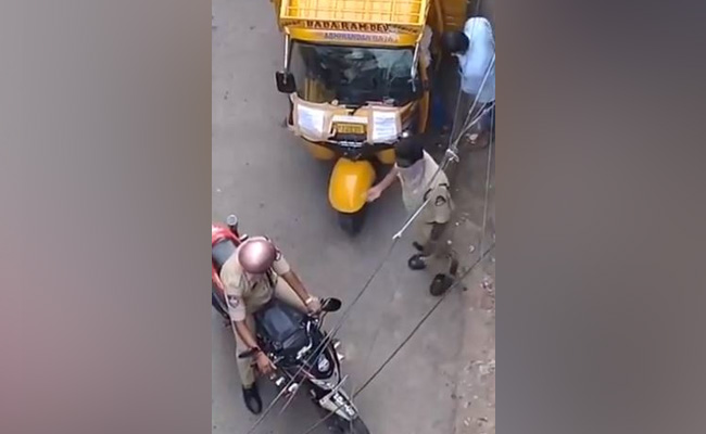 In nearly 44-second clip, two police constables - D Pancha Mukesh and B Suresh - are seen taking bribe from the driver wearing a blue shirt. He hands out the money to one of the police officers while the other cop is sitting on a motorbike. The constable who took the bribe then sits on the bike and both of them leave.