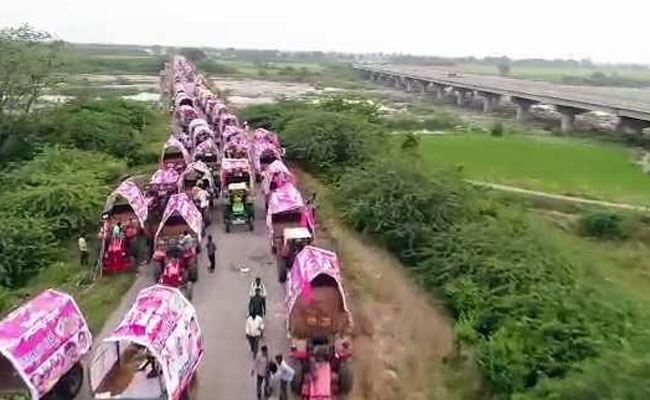 Two days before the meeting itself, about 2,000 tractors carrying some 20,000 farmers were making their way from Khammam towards the meeting venue - about 300 km away - all draped in pink. TRS leaders say one lakh people were expected at the venue today, a day before the meeting itself.