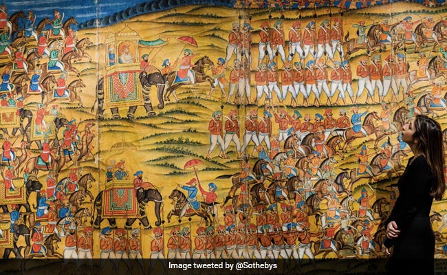 A vividly illustrated painting depicting a historic victory of Mysore ruler Haider Ali and his son Tipu Sultan over the East India Company in 1780 went under the hammer in London on Wednesday for whopping 630,000 pounds.